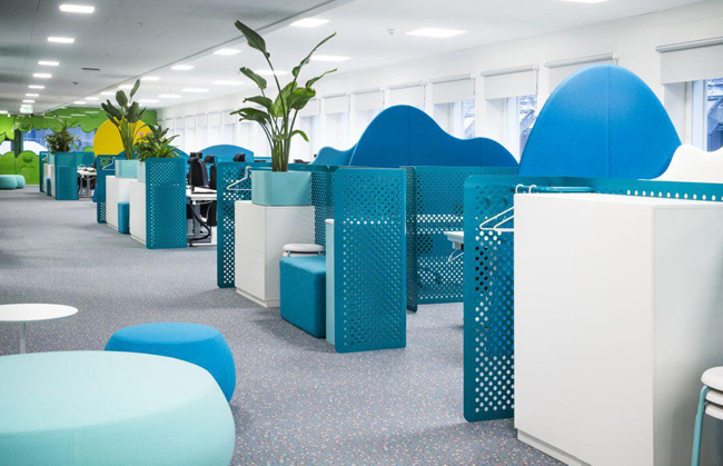 4、動漫公司辦公室裝修:以一個開放式的辦公環(huán)境為宗旨,旨在培養(yǎng)員工的團隊協(xié)作能力和溝通能力,而隨處可見的沙發(fā)座椅大大方便了員工之間的溝通交流。放松心情的辦公氛圍也使得靈感隨時都有可能迸發(fā),公司員工能夠享受到以任何自己喜歡的方式進行靈感的創(chuàng)作。除了主要的工作區(qū)域,辦公室的其他功能區(qū)也各具特色。以天然綠色為背景的圖書館能夠為員工提供寧靜安逸的閱讀空間,另外還有包括蹦床、球類等讓員工可以盡情玩樂游戲室,閑暇之余聊天放松的咖啡廳。而餐廳的設計有吸引力,將餐廳設計成一個復古的美式游樂園,搖椅或旋轉木馬般的座位,極具童心童趣。